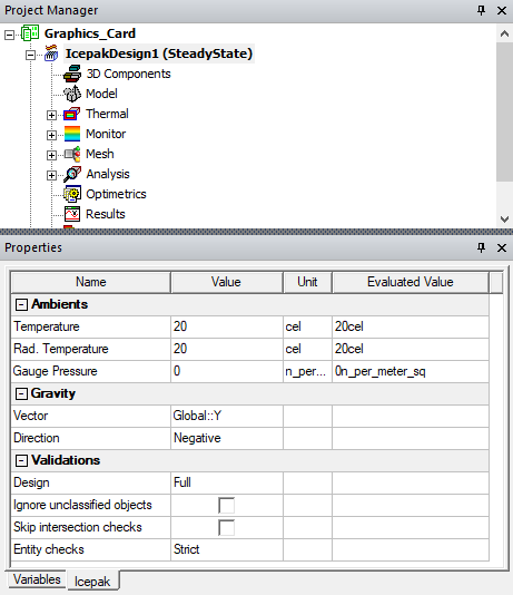 The Icepak>Design Settings command displays the Icepak Design Settings dialog with tabs for Ambient Conditions, Gravity, and Validations. Selecting a current design in the Project tree also displays the Design Settings in Properties window under the solver tab.