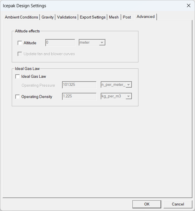 If a fan or blower is present in the model, enable Update fan and blower curves. This automatically updates the fan characteristic curves based on the ratio of densities of air at the specified altitude and the sea level. Note that this option updates the curves for characteristic curve fans only. Fixed flow fans will have the same constant mass/volume flow at higher altitudes as they do at sea level, albeit with a lower air density.