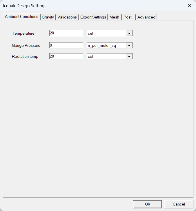 The Ambient Conditions tab allows you to specify the default ambient values for Temperature, Gauge Pressure, and Radiation temperature.