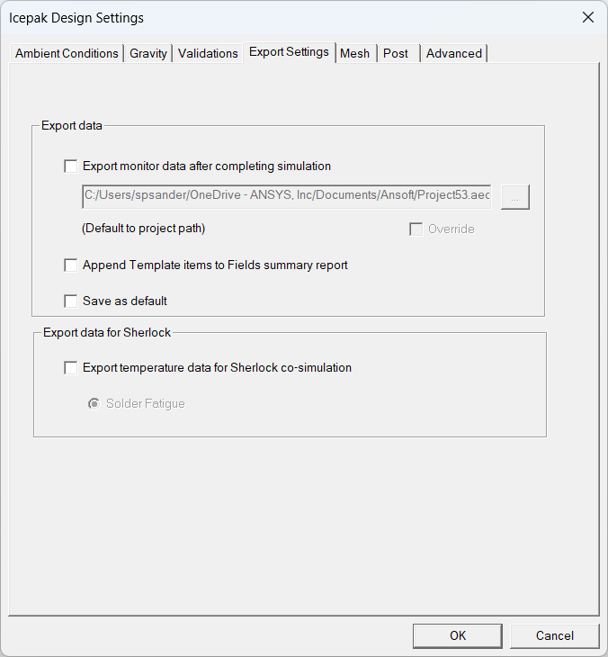 Under Export data for Sherlock, enable Export temperature data for Sherlock co-simulation to automatically generate temperature data files for use in Ansys Sherlock. By default, the directory "projectname.aedtexport" is created in the project directory (the location where the .aedt project file and folder are saved). The file path is displayed in the Message Manager.