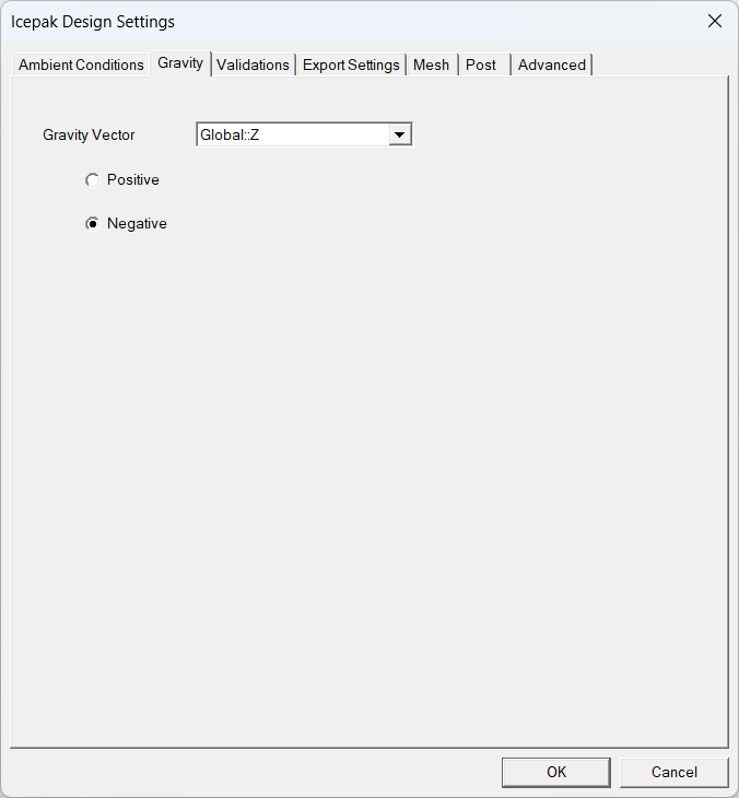 When including the effect of gravity for a natural convection simulation, select the appropriate coordinate direction from the Gravity Vector drop-down menu. Also, select Positive or Negative to select in which direction to apply the gravitational acceleration. The gravitational acceleration in Ansys Icepak is 9.80665 m/s2 in the selected coordinate direction.