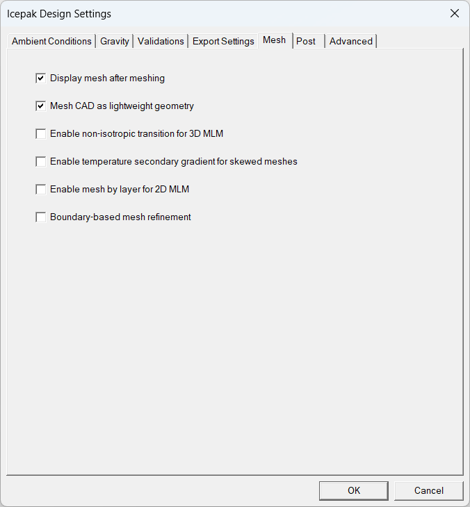 The Mesh tab allows you to enable meshing options for Icepak designs.