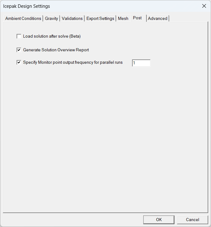 The Post tab allows you to enable post-simulation options for Icepak designs.