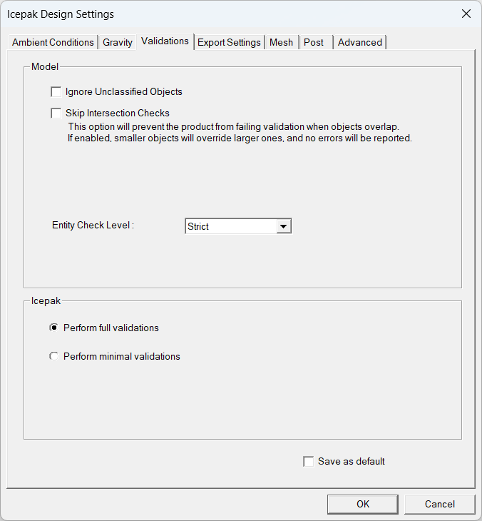 The Validation tab offers choices for model validation and Icepak validations to control the extent of validations performed, and therefore the time involved. You can adjust the degree to which the software checks a model for faults that could jeopardize mesh accuracy. There are four levels of model validation that a user can specify for a given design: Warning Only, Basic, Strict, and None. Note that this setting affects only the "3D Model" stage of a design validation. The default Entity Check Level is Strict.