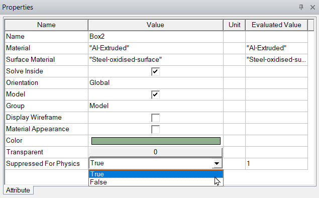 - In the Properties window, select True from the drop-down list next to Suppressed For Physics. Individual geometries that are suppressed appear inactive (grey) in the History tree. Suppressed components appear inactive under Components in the Project Manager.