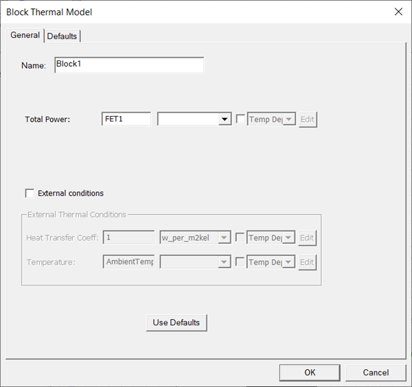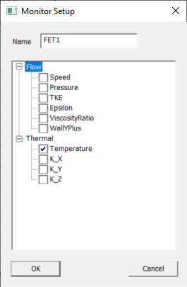 - Create temperature monitor points for each Total Power variable using the same name as the variable. In this example, assign a temperature monitor point named FET1 to the geometry associated with the block boundary condition whose Total Power is defined as FET1. Repeat for FET2, FET3, and FET4.