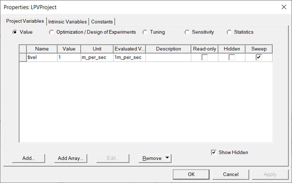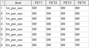 - From Optimetrics, create a parametric setup using all of the variables you've created. Define a nonzero value for the velocity variable. For the power variables, each row in the parametric table should have one variable with the same nonzero value and all other variables with a value of 0. The example below features velocity values of 1 m_per_sec and 2 m_per_sec and a power value of 5W.Note: