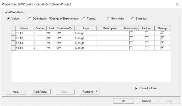 - Define local design variables to be used in the parametric analysis. For example, create variables to be used to define the power for block boundary conditions.