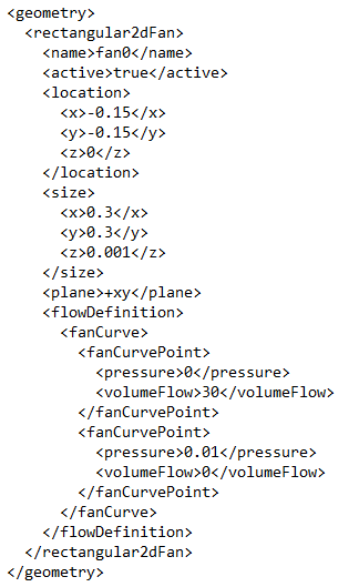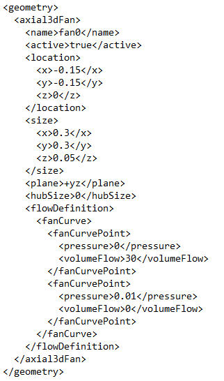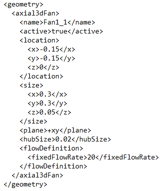 The following is the EC XML format for a 3D fan component with a Fixed Volumetric specified as the Flow Type.