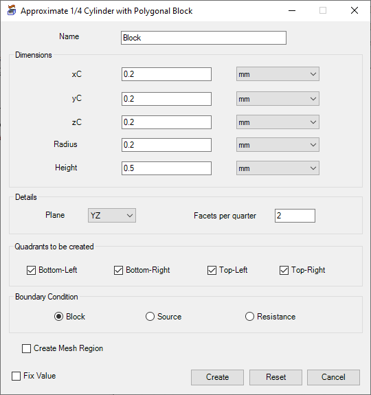 Approximate 1/4 Cylinder with Polygonal Block enables you to create geometry, assign a boundary condition, and create a mesh region for a one quarter or more of a cylinder object.