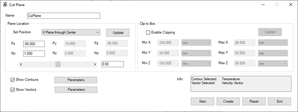 | New, Create, Reset, Exit | Click New button to create a cut plane (if not already created) based on selected options and then show the preview of new cut plane with all values reset to default values. Use the New button control to adding multiple contours without closing the toolkit. Click Create to create the cut plane based on the current selections. Click Reset to restore default values. Click Exit to close the Cut Plane dialog box. |