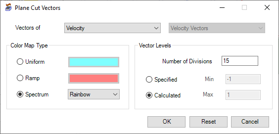 | OK, Reset, Cancel | Click OK to save the settings and close the Cut Plane Vectors dialog box. Click Reset to restore default values. Click Cancel to close with dialog box without saving. |