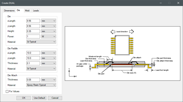 Under Die Attach, specify the thickness of the die attach material and the material. |