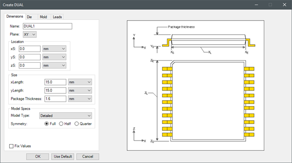Under Size, specify the length of the package in each coordinate direction. The coordinate direction represented by Package Thickness depends on the selected Plane. |