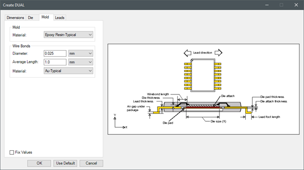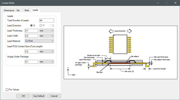 Under Leads, specify the number of leads, the direction in which the leads will point, the lead thickness and width, material, foot length, and airgap under the package. |