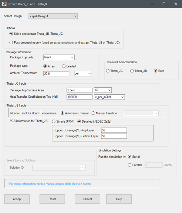 | Simulation Settings | If you selected, Solve and extract Theta_JB and Theta_JC, choose wher to run the simulation in serial or parallel mode. For parallel simulations, specify the number of cores to use. |