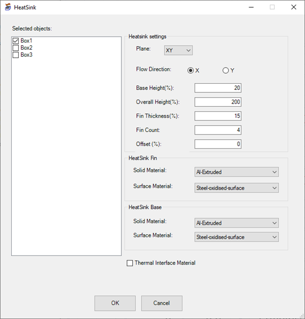 | Thermal Interface Material | Enable Thermal Interface Material to create a box between the heatsink and the selected box geometry. The Thermal Interface Material geometry is assigned Copper as its material. |