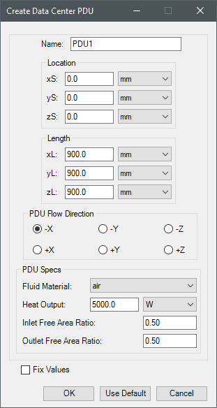 | PDU Specs | Under PDU Specs, specify the fluid material, heat output, and free area ratio of the inlet and outlet. |