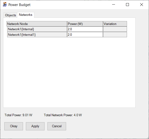 The Objects tabs shows all boundary conditions with a power assignment, including the sum of all network power assignments. The Networks tab displays only network boundary conditions with power assignments. |