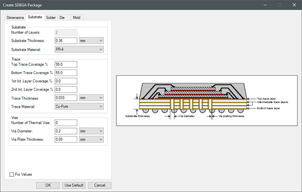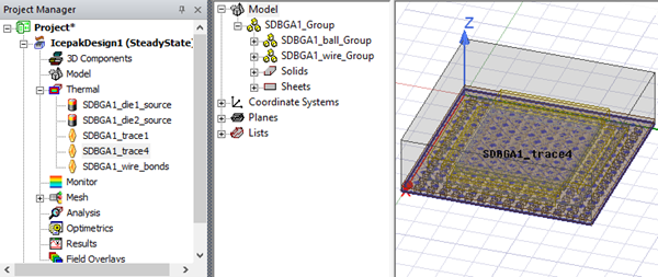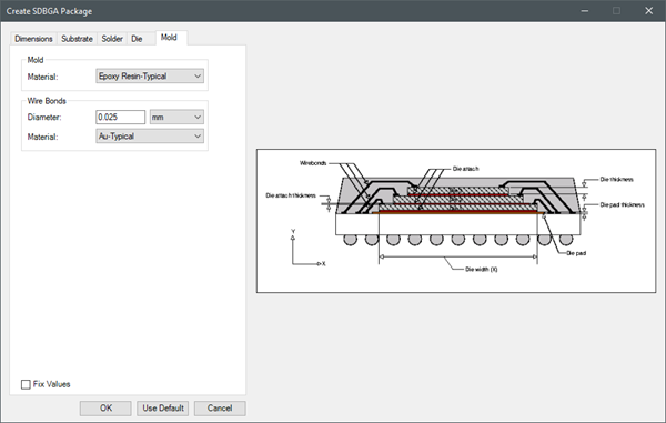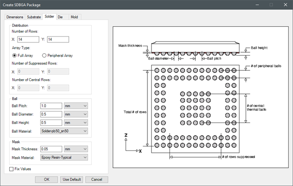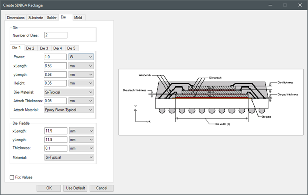 SDBGA enables you to create geometry and boundary conditions to represent an stacked die ball grid array package.