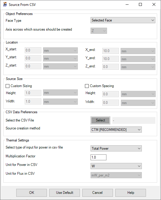 Source From CSV allows you to create a source object from a comma-separated value file. The sources can be modeled as a CTM native component or source thermal boundary conditions. The CTM native component option is recommended. The Individual Sources option takes longer to process as individual source geometry are created and boundary conditions automatically assigned.