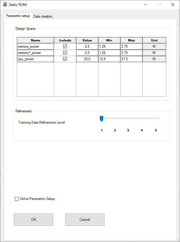 The Static ROM toolkit allows you to extract training data from Icepak for use inTwin Builder for ROM creation and validation. On the Parametric Setup tab, configure the parametric trials with the desired design variables. After running the parametric trials, use the Data creation tab to export the training data. In Twin Builder, use the data to build and validate a static ROM.