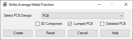 Write Average Metal Fraction allows you to calculate the average metal fraction for each layer of a PCB linked to an HFSS 3D Layout design. It also creates a PCB in a new project using one of three methods: 3D Component, Lumped PCB, or Detailed PCB.