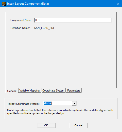 - Choose the Target Coordinate System on which to base the layout component placement. Relative coordinate systems, defined in the target design prior to starting the Browse Layout Component process, appear in the drop-down menu in addition to the Global CS.