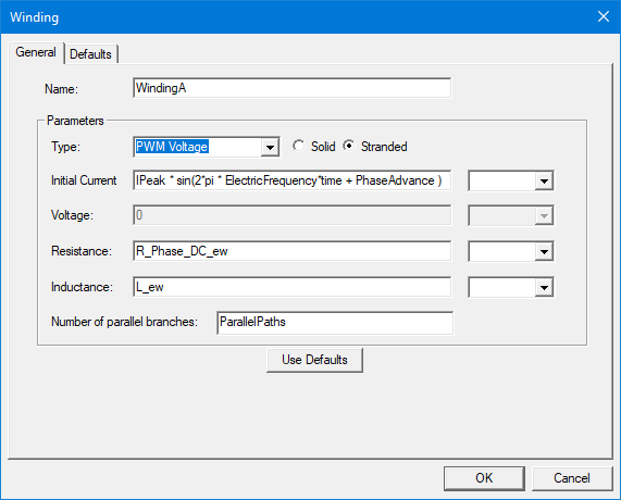 - Define three PWM voltage windings. For the Type option in the Winding window, make sure to select PWM Voltage: