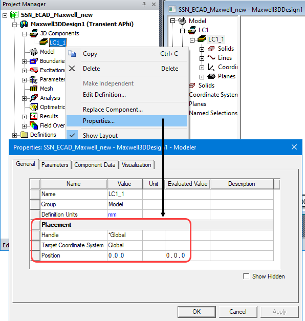 For a video demonstration of how to move a component using its handle and target CS, see Editing 3D Component Properties.