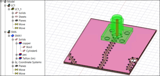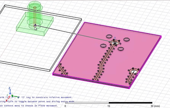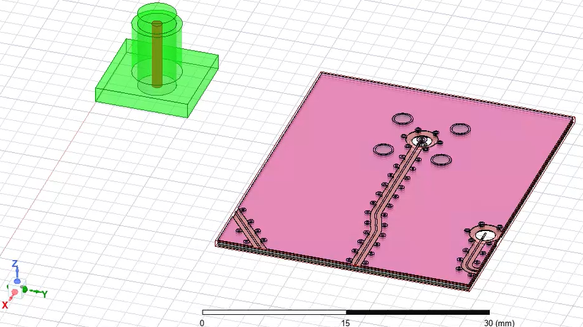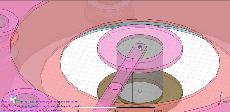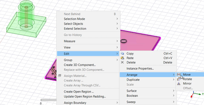 To demonstrate, we will have the example shown below. The green component is a 3D component, and the pink component is an imported layout component. In this example, you want to place the layout component under the 3D component so that its holes (in the middle of the component) are aligned with the hole from the 3D component.
