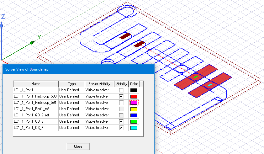 To visualize the actual geometries for the terminal assignment, select the design name in the Project Manager window, and either right click to select Boundary Display (Solver View), or select Maxwell 3D > Boundary Display (Solver View). The Solver View of Boundaries dialog box will open for selecting terminals for viewing. In the first example that follows, there is a port assigned on two pin groups. Each pin group consists of two terminals. Turning on the visibility will display all the terminals under this port in the same color. All the child excitations of the port, including the two pin groups and the four terminals are disabled: