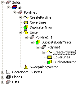 The history tree also lists the history of all commands carried out on a model's objects (for example, “CreateBox” or “Subtract”). This history is displayed in the order in which it occurred. Here is a history tree from the waveguide combiner example project: