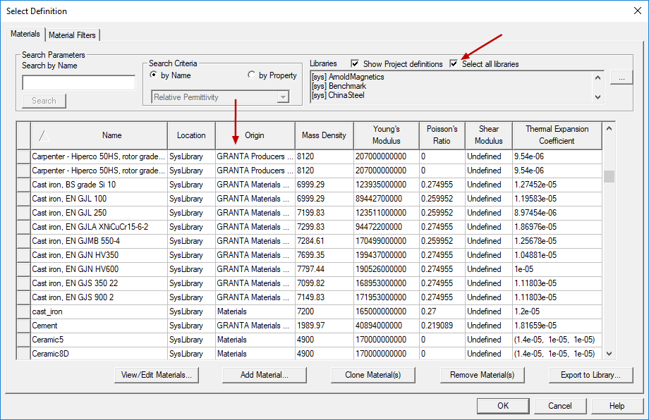 - In the Libraries list, ensure that one or more of the previously listed suitable libraries are selected, or a user library with mechanical material properties. Click the ellipsis button ( ... ) to the right of the Libraries list to access a pop-up dialog box in which you can select which libraries to include in the Materials list: