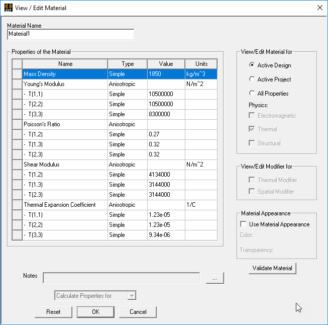 - Optionally, to specify anisotropic properties for the Young's Modulus, Poisson's Ratio, Shear Modulus or Thermal Expansion Coefficient (when properties vary in the three global directions), select Anisotropic from the Type drop-down menu. Otherwise, the Simple option is for isotropic properties (when the properties are the same in every direction).