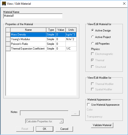 - If editing properties, or defining a new material, specify the desired Material Name, Mass Density, Young's Modulus, Poisson's Ratio and Thermal Expansion Coefficient.