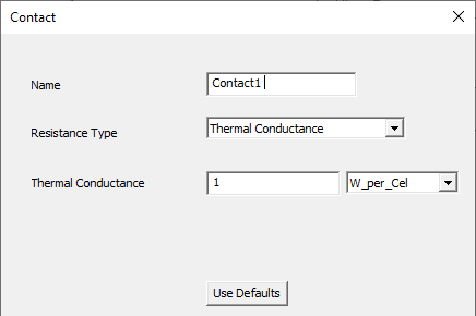 It is important that you read and understand the Contact Guidelines and Examples topic before attempting to assign contact to your model. Doing so will help to ensure that the appropriate object faces are selected and that thermal resistance is correctly defined. The procedure for assigning thermal contact is as follows:
