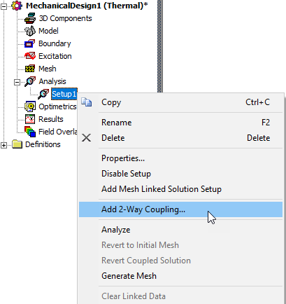 10. In the Mechanical design, right-click the analysis setup in the Project Manager and choose Add 2-way Coupling: