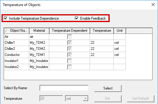 The check boxes in the Temperature Dependent column indicate which objects have temperature-dependent material properties assigned to them.