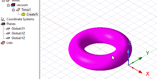 Draw a torus by selecting its center point, major radius, and minor radius. The modeler then sweeps a circle around a circular path. A torus is drawn as true surfaces in the modeler. Before you draw a torus, you can specify the coordinate system, and you can set the drawing plane as Z, Y, or Z, or you can edit the plane in the properties.