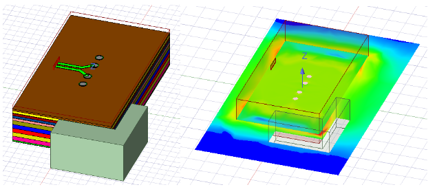 During post processing, when generating field or mesh plots, anything on the interior of encrypted components will not be shown to maintain data security. The figures below show an example project with both layout components and encrypted 3D component (left) and its resultant field plot (right).