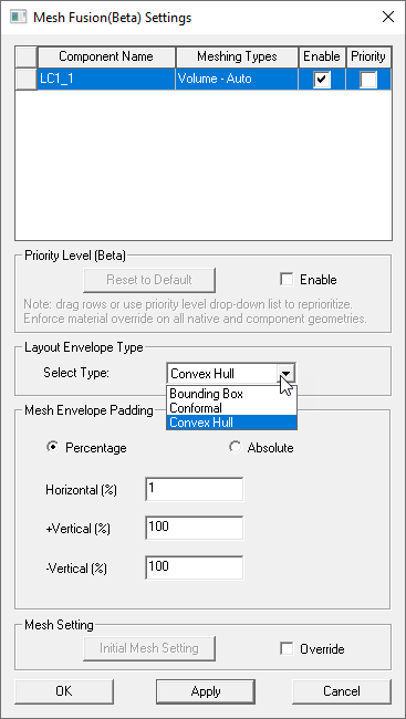 When you select a component for Mesh Fusion a mesh region is required to define the meshing boundaries between this component and native geometries. The choice of the mesh region directly affects the quality of the resulting mesh. Layout Component includes envelope options that allow flexibility in handling Layout Component meshing including Bounding Box, Conformal, and Convex Hull.