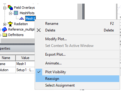 If you want to reassign a mesh or field plot, either select 3D geometries from layout components in the modeler window before selecting Reassign in the right-click menu, or select Reassign.
