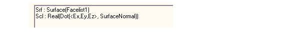 For example, if the top stack entry in the Field Calculator is a surface and the second stack register is for the real part of the E Vector ("Real(<Ex, Ey, Ez>)"), the resulting quantity will be an expression for the real part of the E vector on the surface (a VecSrf quantity). Again, the result of this command is still a placeholder expression, not the final numerical values.