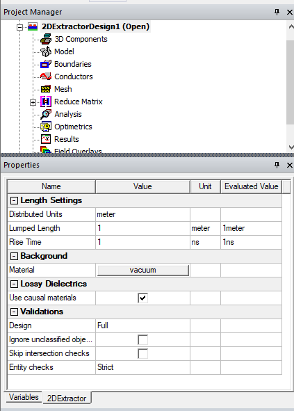 You can also view and set Design Settings by selecting the current project and then the 2D Extractor tab in the Properties window.