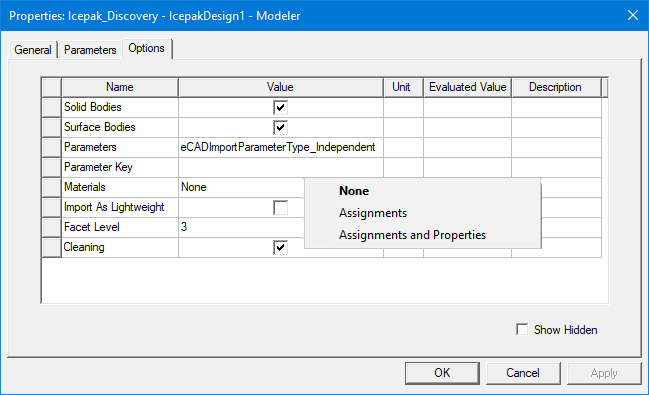 - The Options tab shows supported options. Note that Materials\Assignments and Properties is only available for Icepak and Mechanical designs. See Discovery Link Options for details on the options in this window.