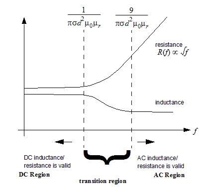 Between the DC and AC regions of operation is a region that spans about 1 decade of frequency where neither the DC nor the AC models are truly valid. Here the skin depth is an appreciable fraction of the conductor depth. See: Estimating R and L Values in the Transition Region.