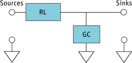 In the lumped circuit approach, Q3D simply lumps all the capacitance and conductance (C and G) at the sink end of the model, and places the inductance and resistance (L and R) between the sources and sinks. See the following figure: