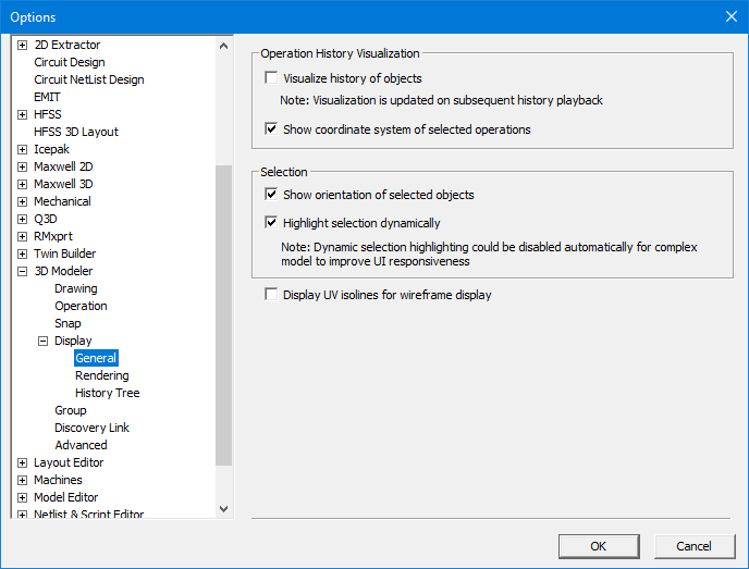 Under Display Options, General options allow you to change how objects are selected and how their history is visualized.