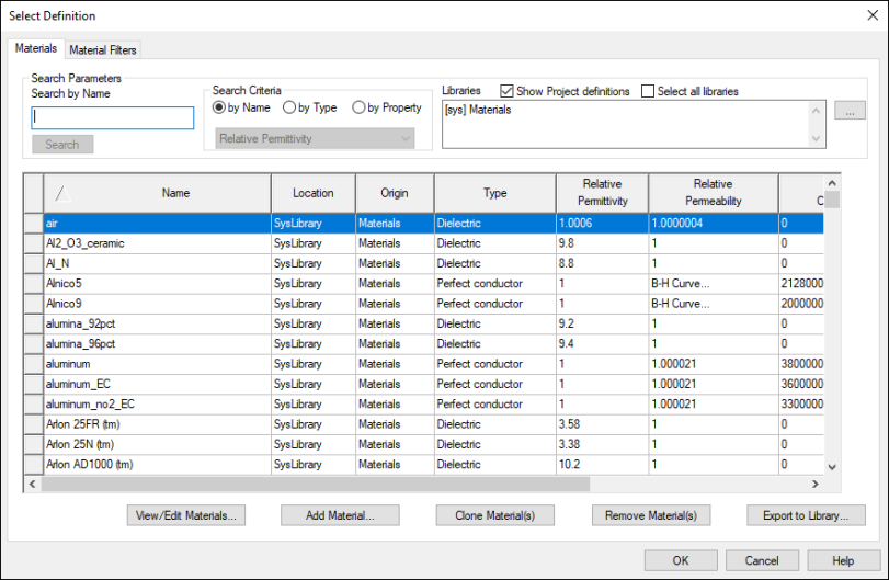 - Under View/Edit Material for, select either Active Project or All Properties. See: Material Properties.